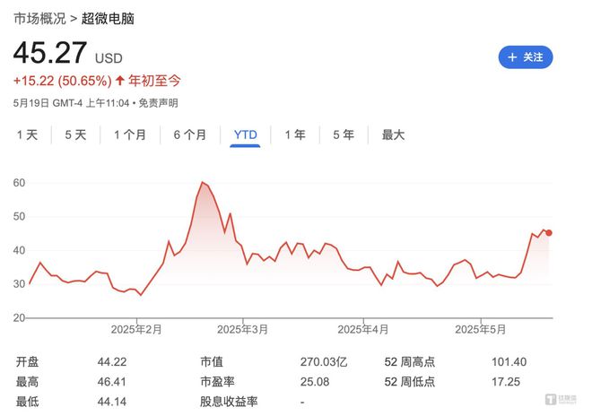 受AI热潮以及业绩不佳等因素影响,超微电脑股价迎来了“过山车”行情。2025年初至今,超微电脑已经累计涨超50%,而最近半个月的时间,超微电脑较低点累计涨超60%。
