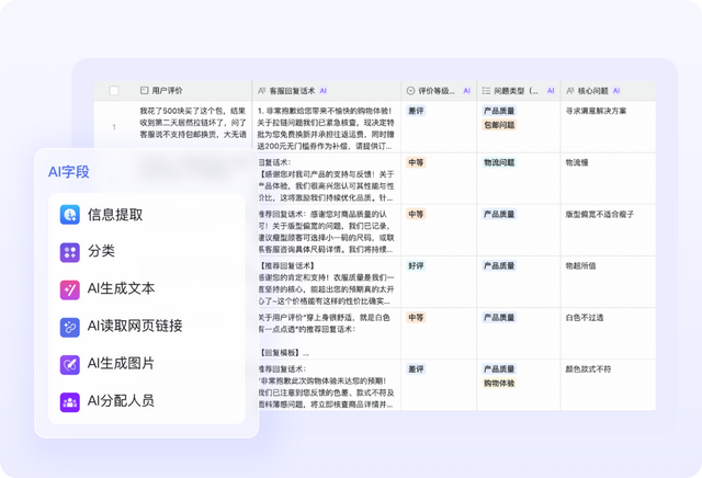 1)将 80 多种字段模板直接嵌入表格,1000 个任务 1 小时完成。用户通过新增字段可实现智能提取、分类、理解、匹配信息,生成文案、图片、声音、视频等多模态内容。并且,配置一次 AI 指令,后续导入新数据,AI 就会自动执行。无论是处理海量电商评价、产品调研,还是信息收集,用户都可以使用这些 AI 字段模板,灵活又强大。