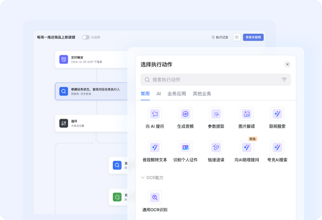3)AI 创建自动化流程,全天候帮你打工。用户只需设定好“触发条件“与“执行动作”,剩下的交给 AI。一旦数据有变动,AI 就会立即响应,完成指定的任务,例如,内容变更自动通知指定人,或到期前自动创建待办提醒,大幅提升流程效率。